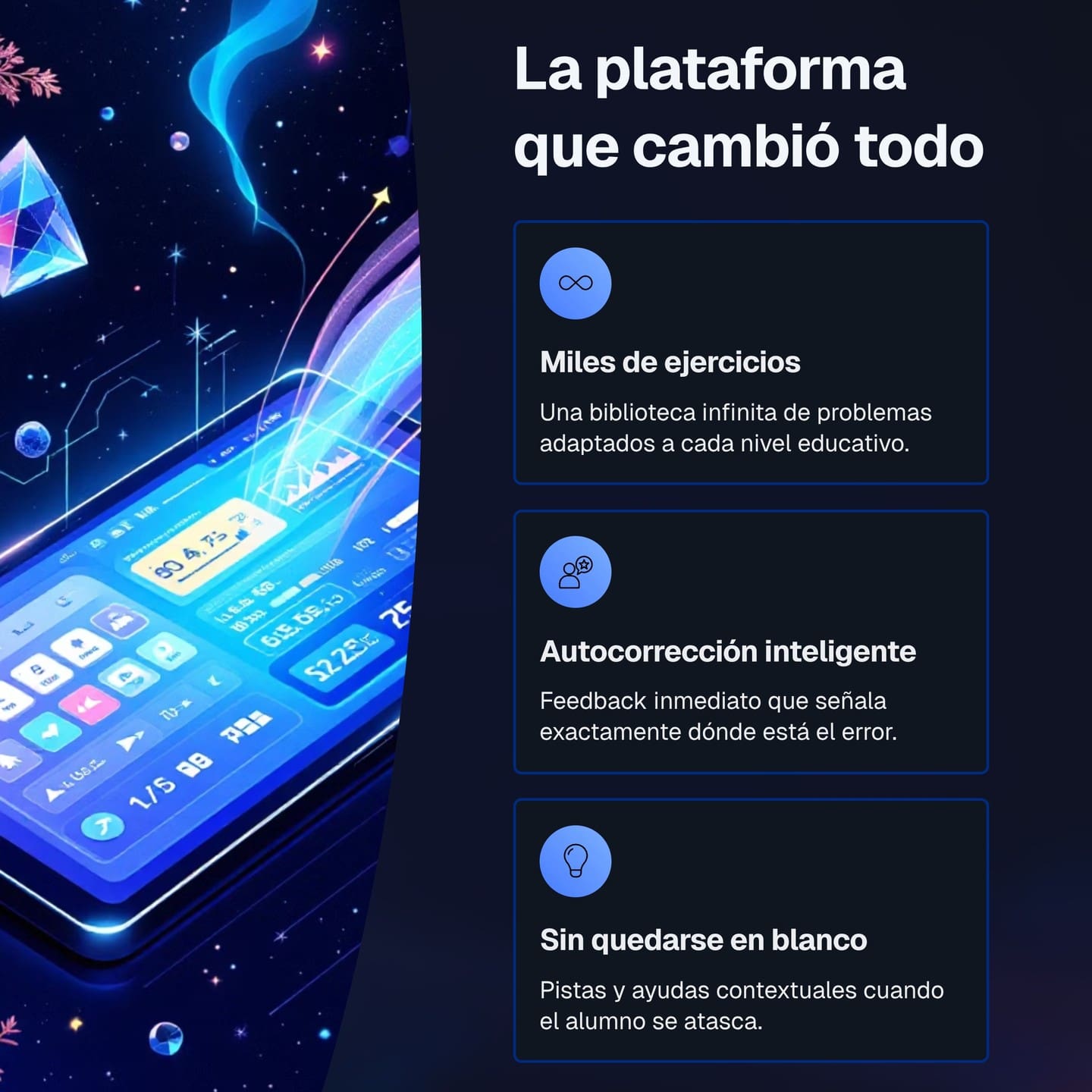 No solo corregimos ejercicios; los explicamos. Si un alumno comete un error lo sabe instantáneamente, y el sistema le muestra el paso a paso para que comprenda el razonamiento correcto, convirtiendo cada fallo en una valiosa oportunidad de aprendizaje.